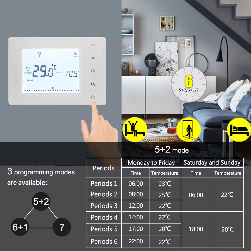 Особенности | Защита от детей (блокировка кнопок), Программируемый режим (недельное рассписание 5+1+1), Ручной режим, Удаленное управление со смартфона через WiFi всеми функциями термостата, Функция "Защита от замерзания" |