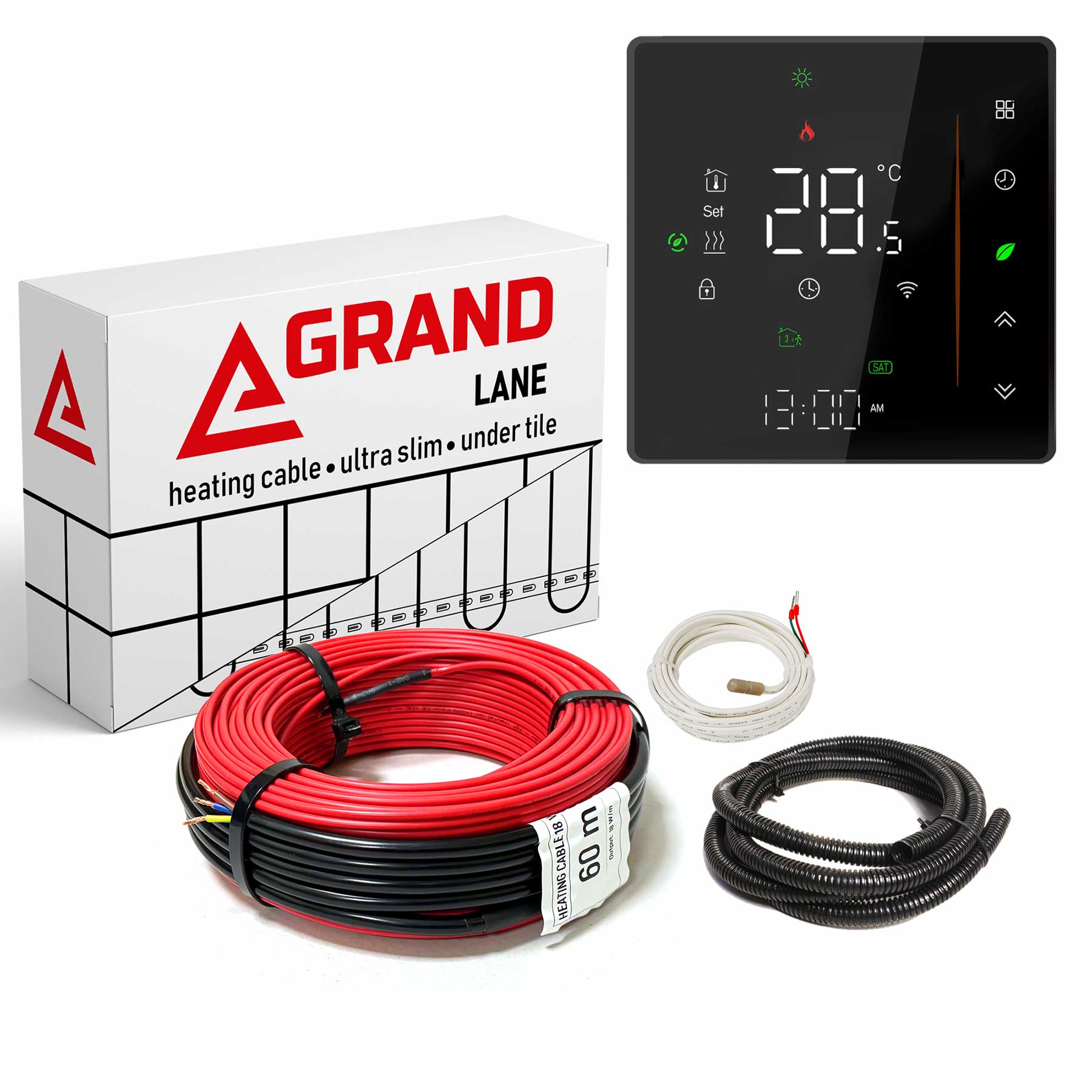Комплект кабель Grand Lane GL-cab 18 + сенсорный программируемый WiFi терморегулятор. Комплект теплого пола в слой плиточного клея или в стяжку.