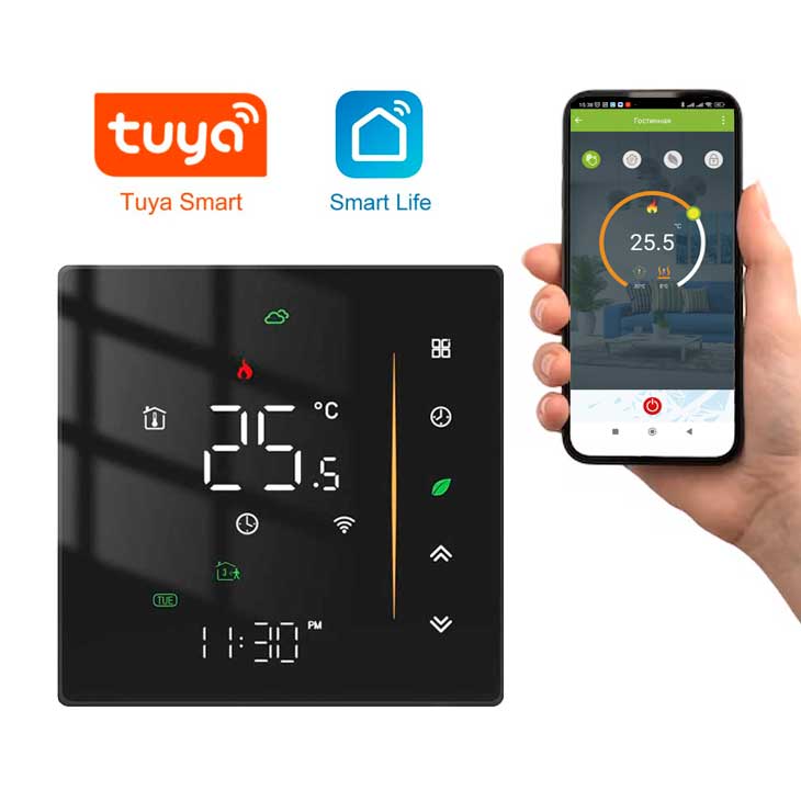 Проводной программируемый терморегулятор SET FLRF-091 WiFi Black для подключения к газовому и электрическому котлу всех брендов. Терморегулятор удаленно (с любой точки планеты) управляется со смартфона через приложение Tuya Smart или Smart Life для IOS и Android.